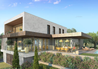La villa se distingue par une architecture contemporaine et épurée, intégrée avec harmonie dans son environnement naturel.
